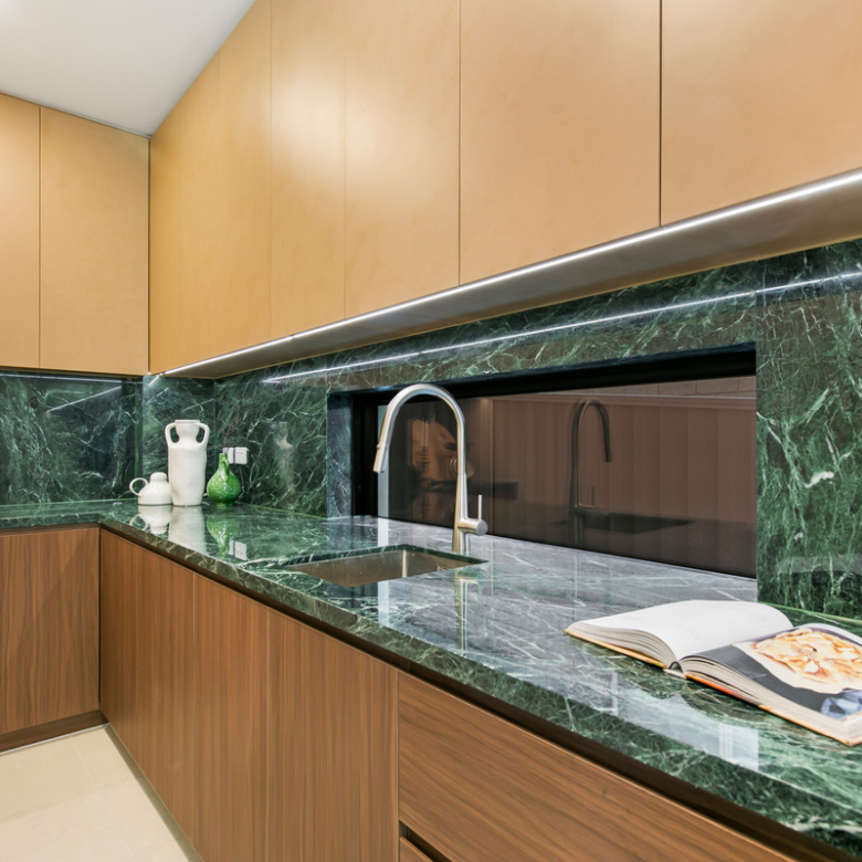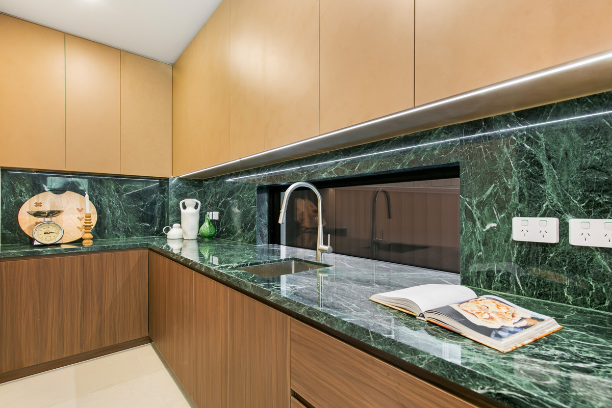 * Quality kitchen with natural marble stone bench tops, St Geroge Tapware, Gas Cooking, Dishwasher, ducted range hood, and butler’s pantry