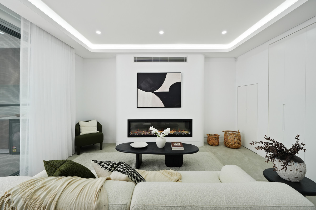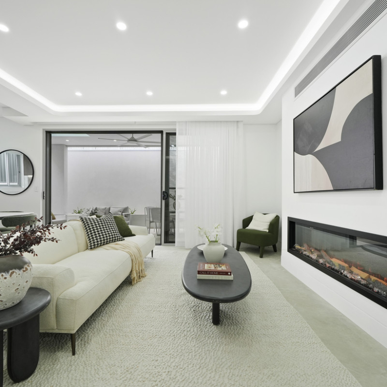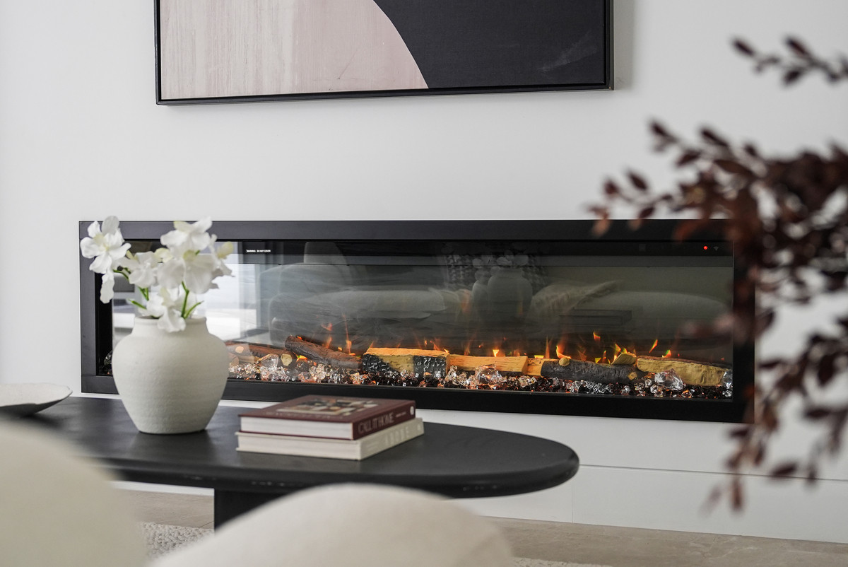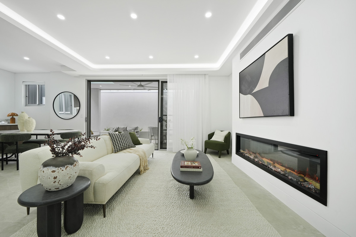 Step inside and be greeted by the light-filled open-plan living and dining area, complimented by a sleek electric fireplace, creating a warm and inviting atmosphere.