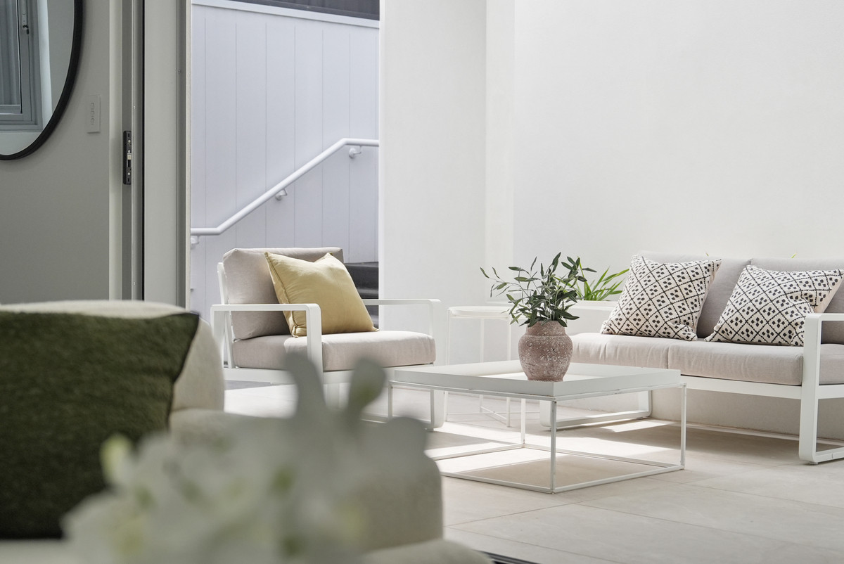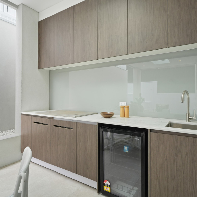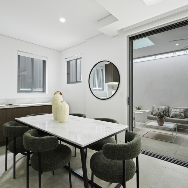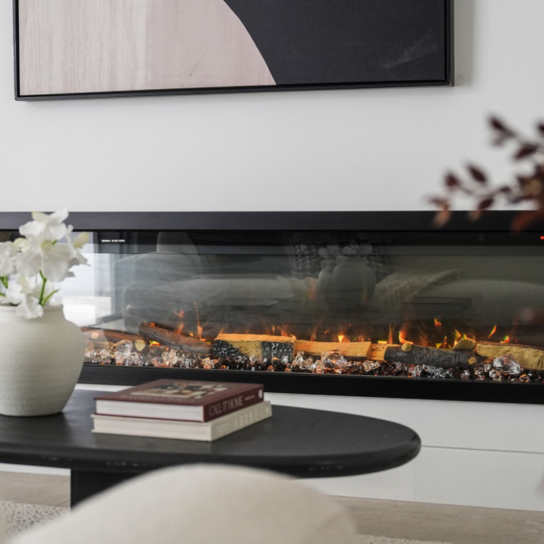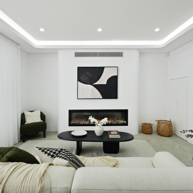 Step inside and be greeted by the light-filled open-plan living and dining area, complimented by a sleek electric fireplace, creating a warm and inviting atmosphere.