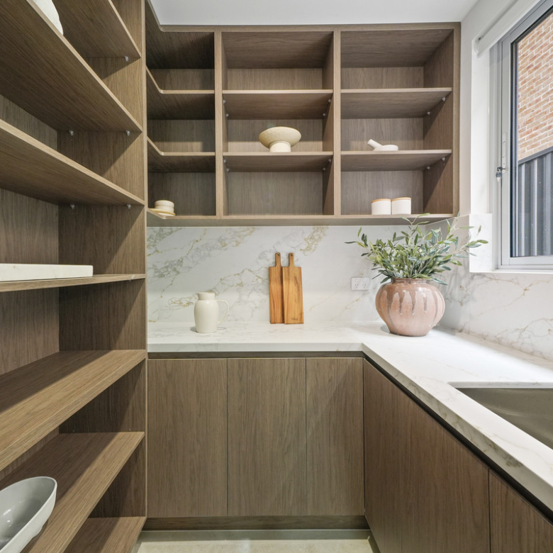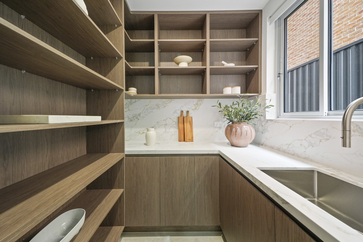 The gourmet kitchen features stone benchtops, premium appliances (SMEG), a butler’s pantry, and ample storage.