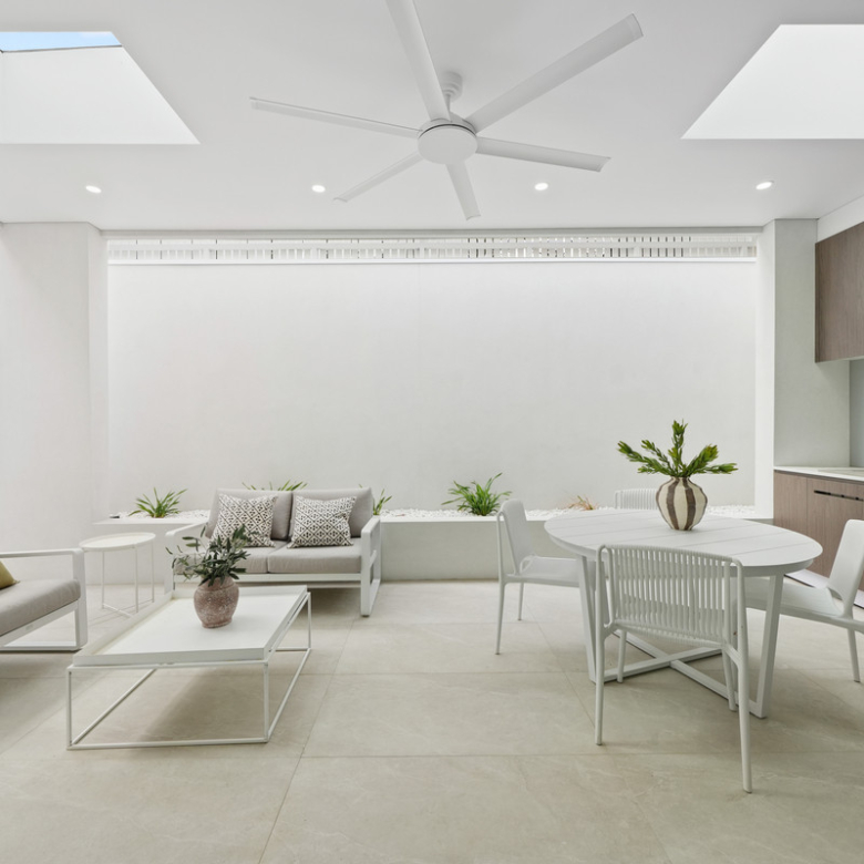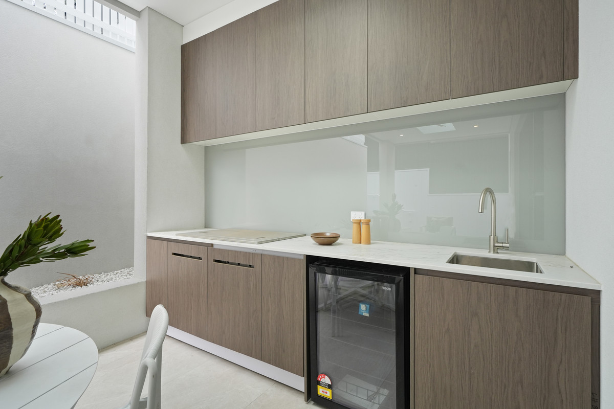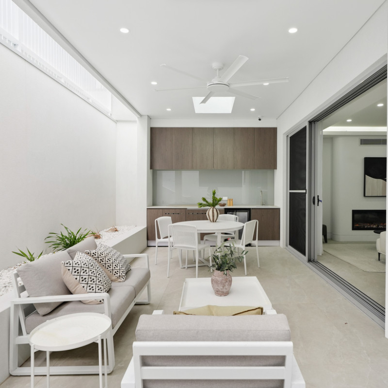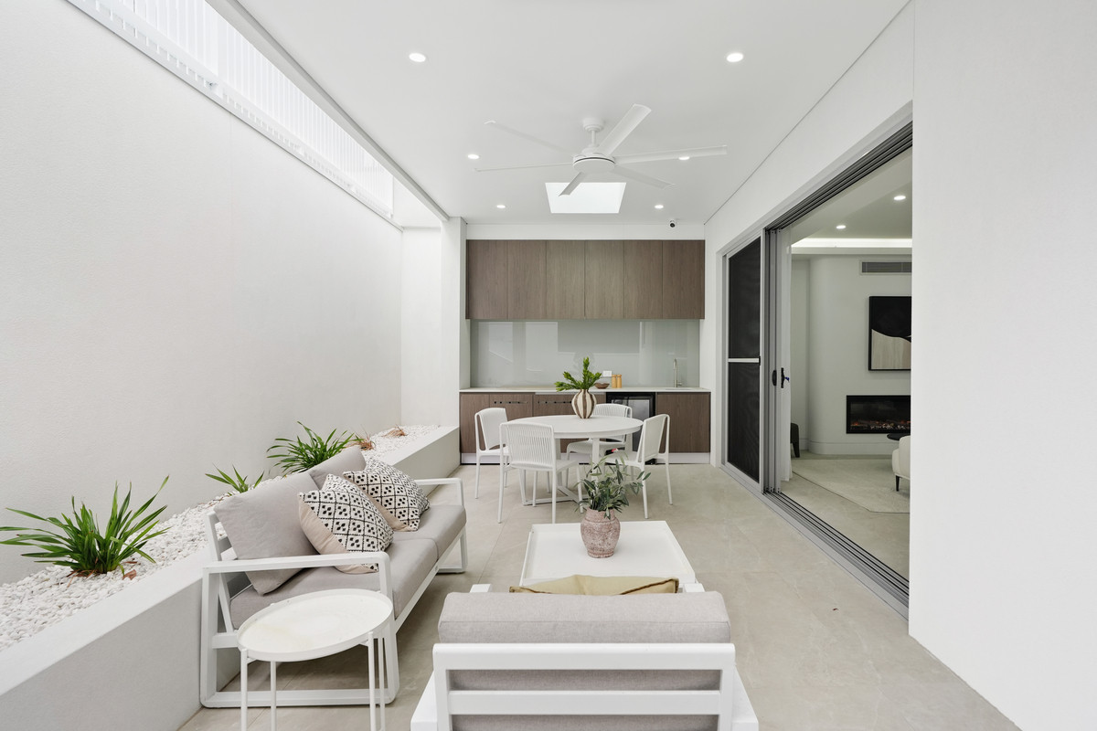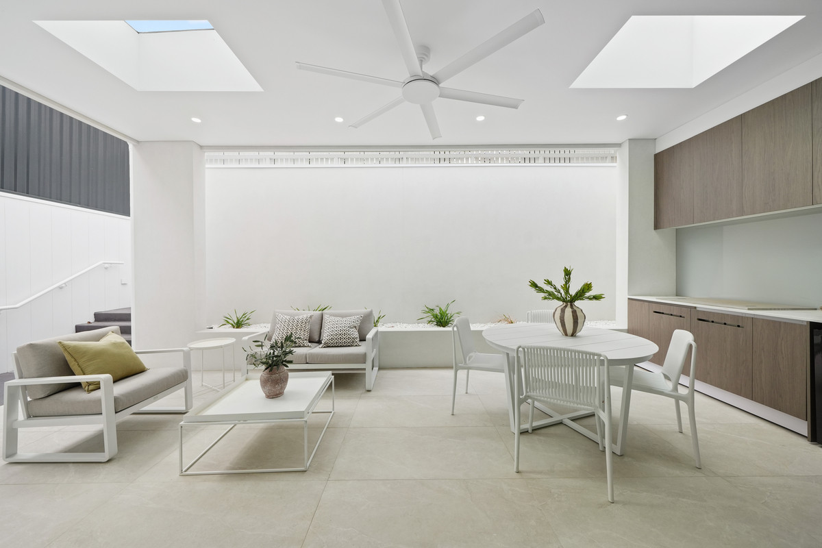 Flowing seamlessly outdoors, the undercover patio offers a complete outdoor built-in BBQ, sink, and cabinetry, all under a skylight that fills the area with natural light, ideal for alfresco dining and family gatherings.