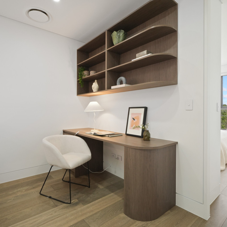 A custom-designed study nook with built-in desk and shelving provides the perfect workspace for students or those working from home.