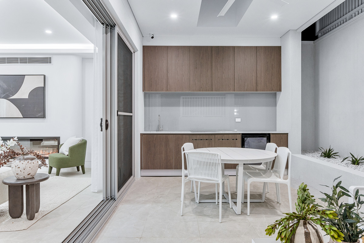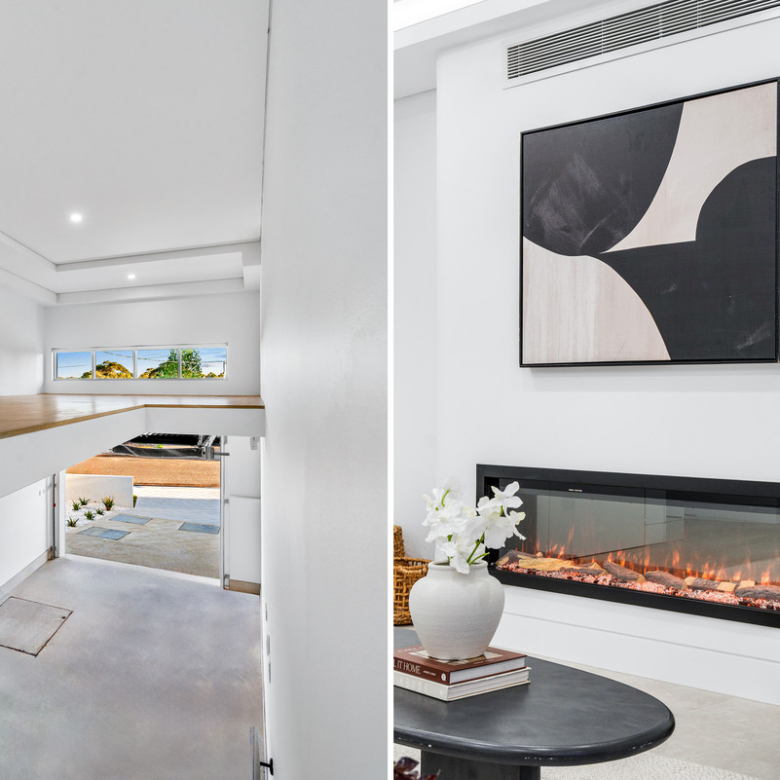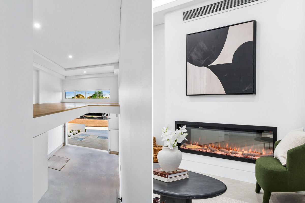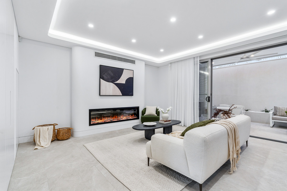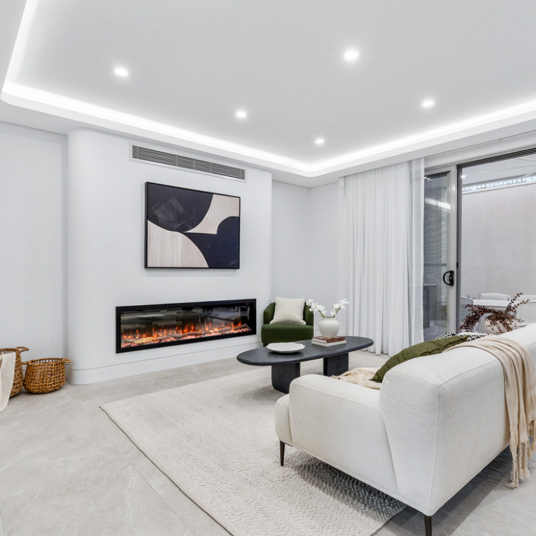 Step inside and be greeted by the light-filled open-plan living and dining area, complimented by a sleek electric fireplace, creating a warm and inviting atmosphere.