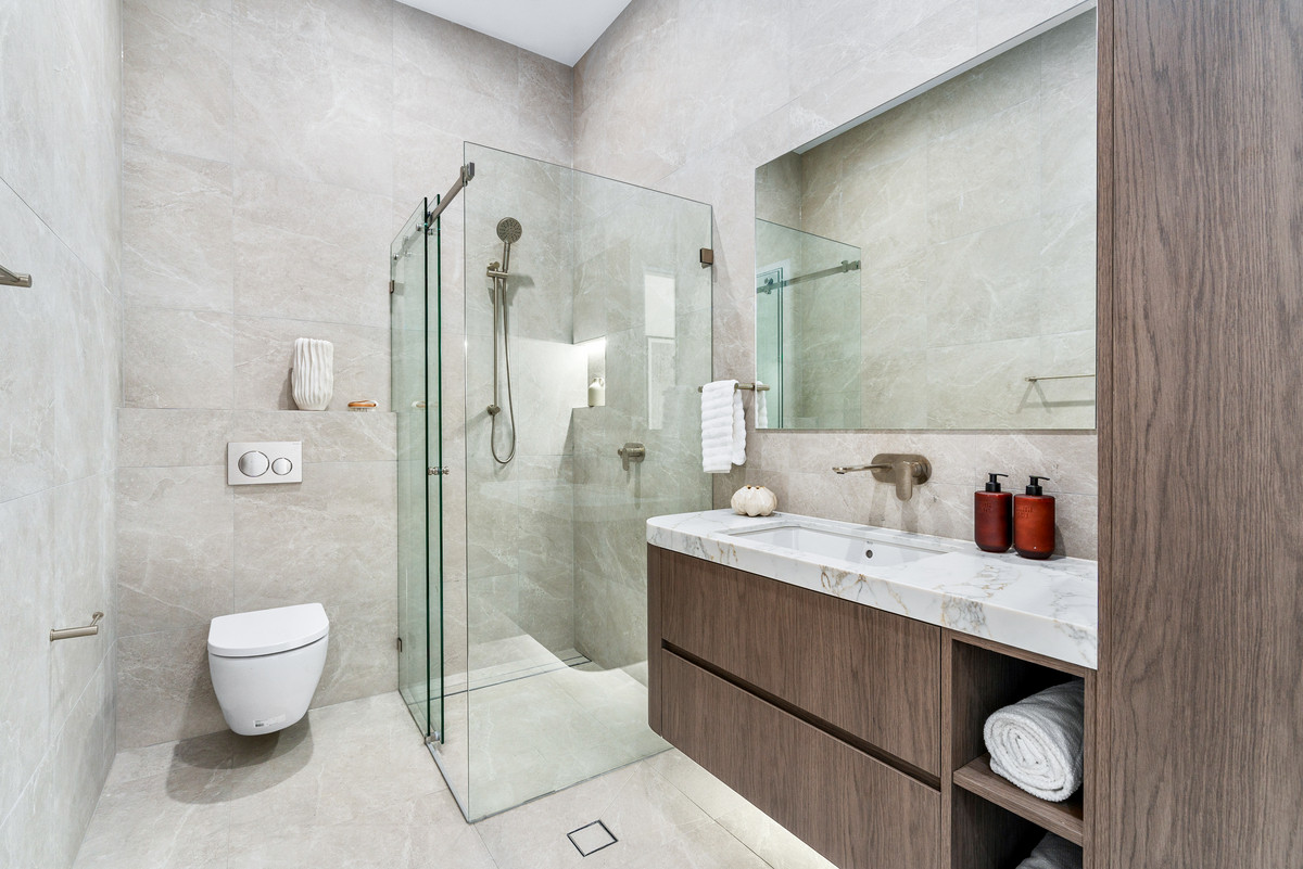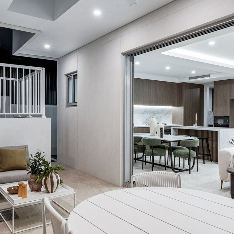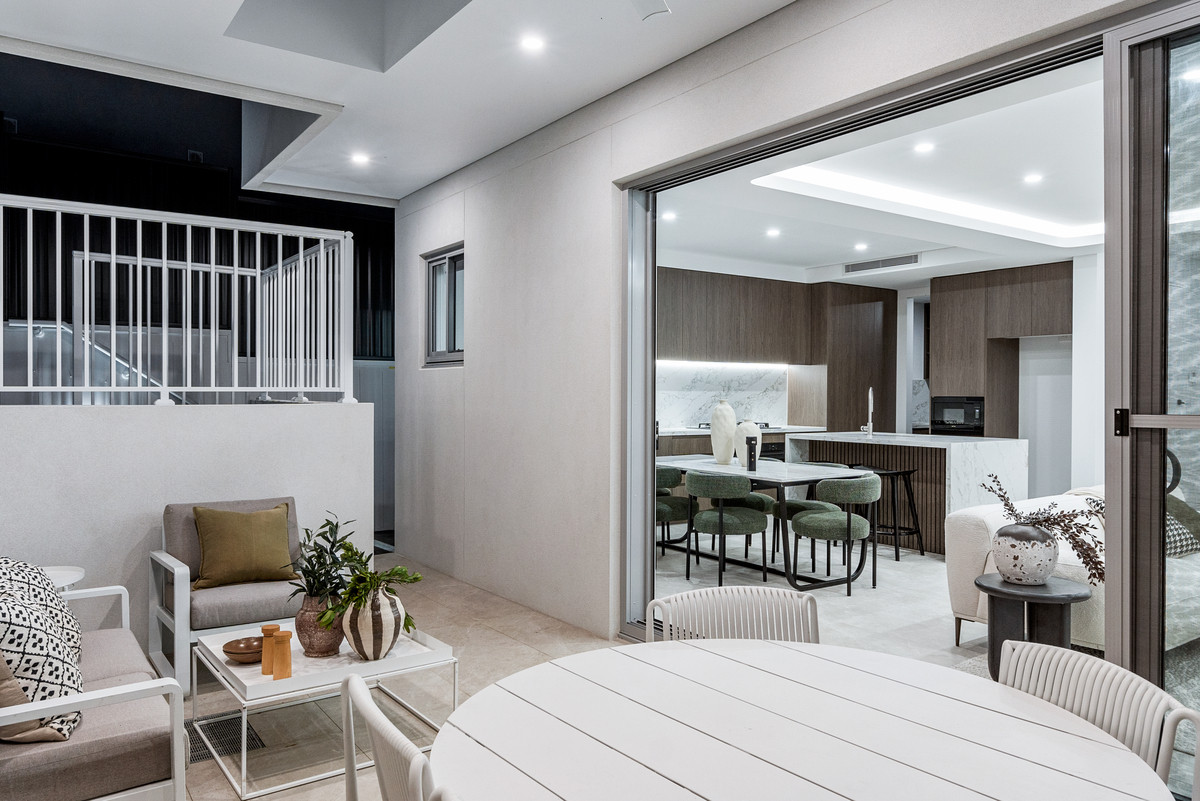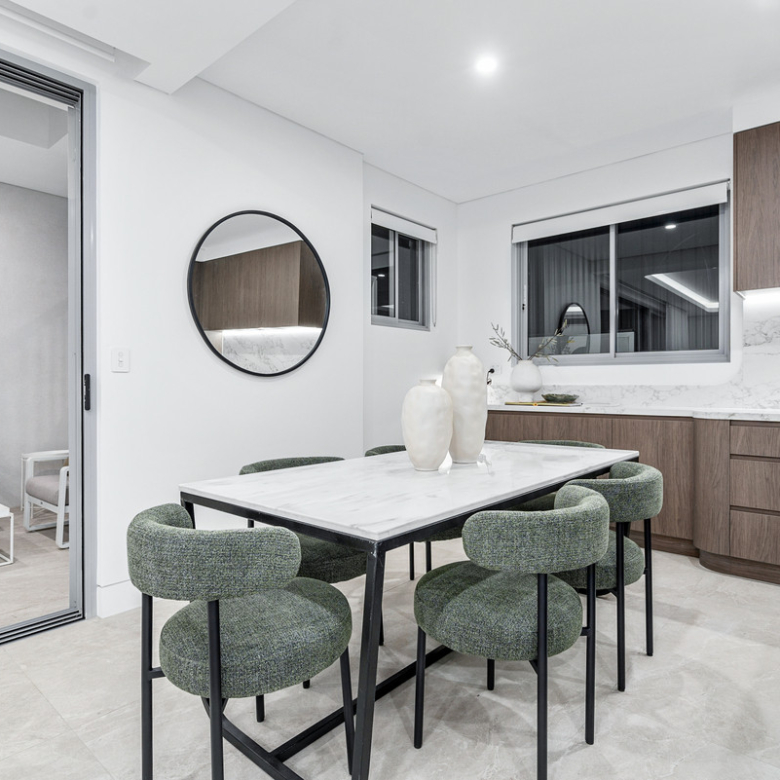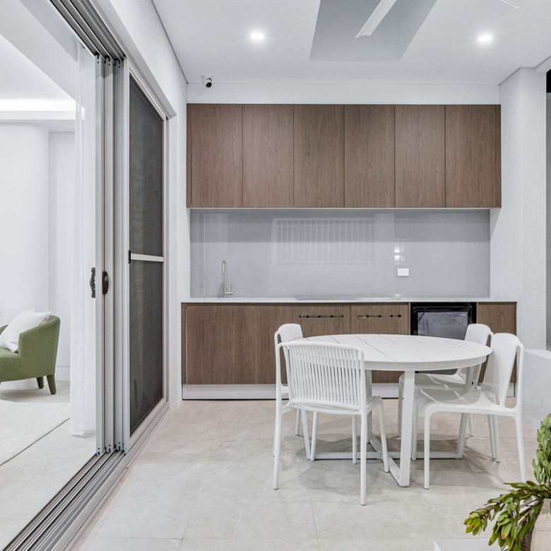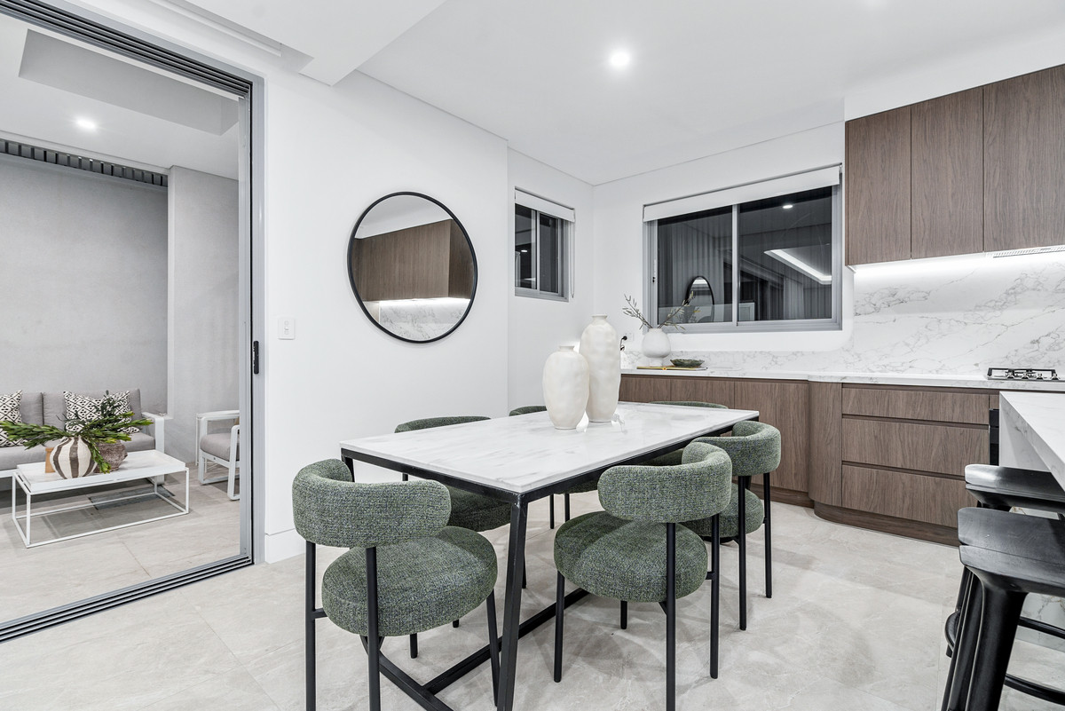 Step inside and be greeted by the light-filled open-plan living and dining area, complimented by a sleek electric fireplace, creating a warm and inviting atmosphere.