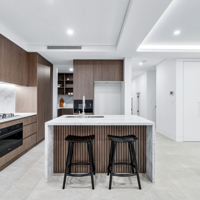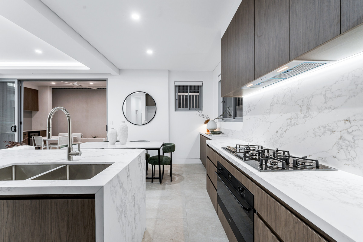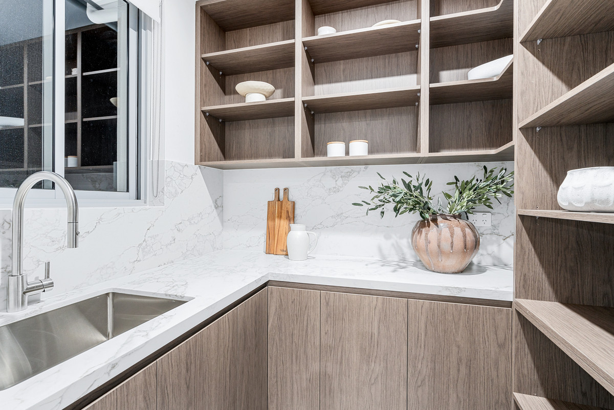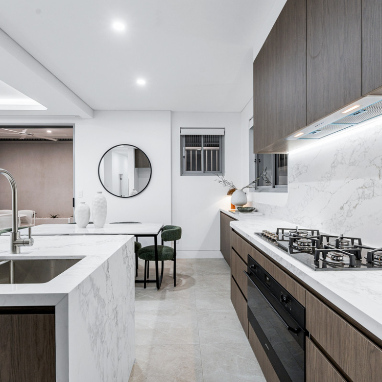 The gourmet kitchen features stone benchtops, premium appliances (SMEG), a butler’s pantry, and ample storage.