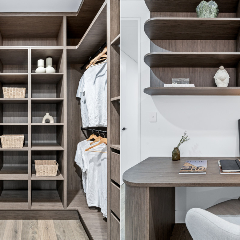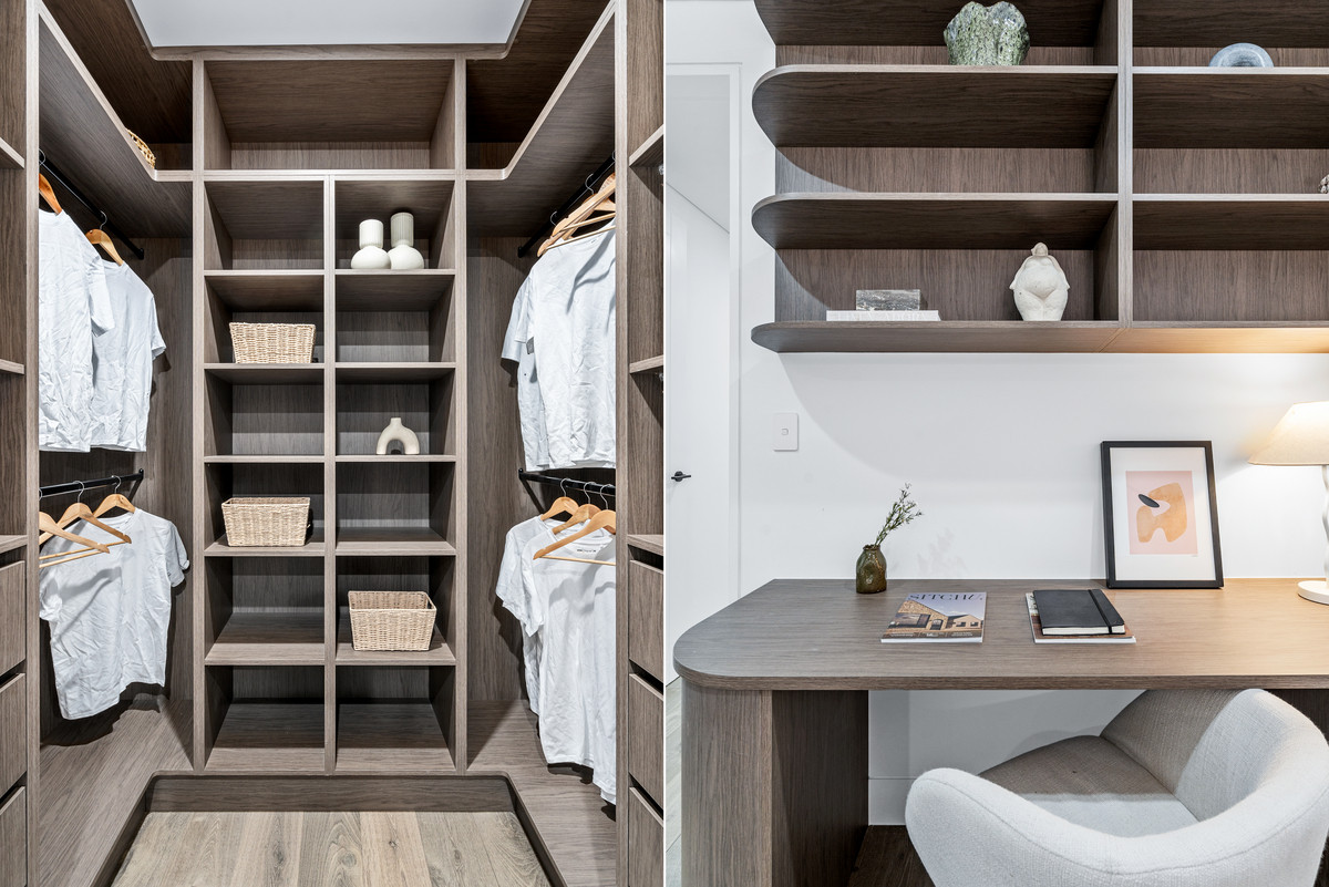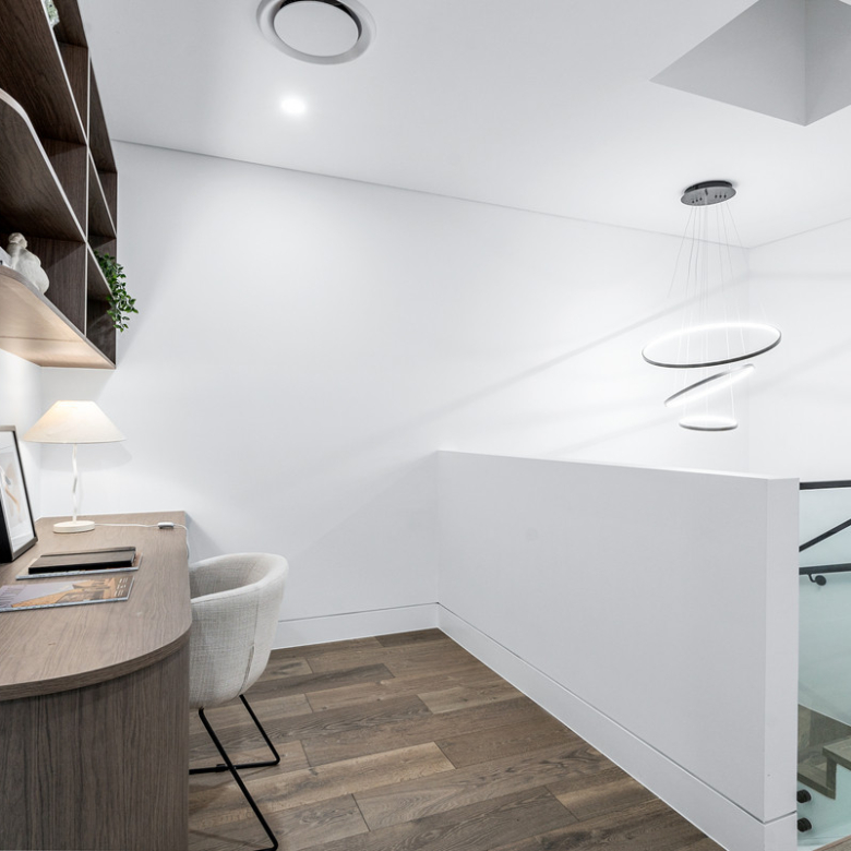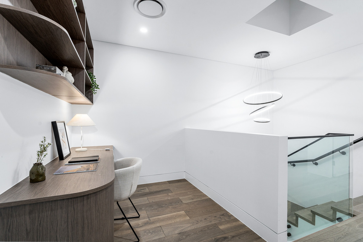 A custom-designed study nook with built-in desk and shelving provides the perfect workspace for students or those working from home.