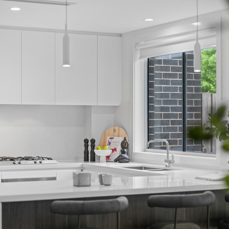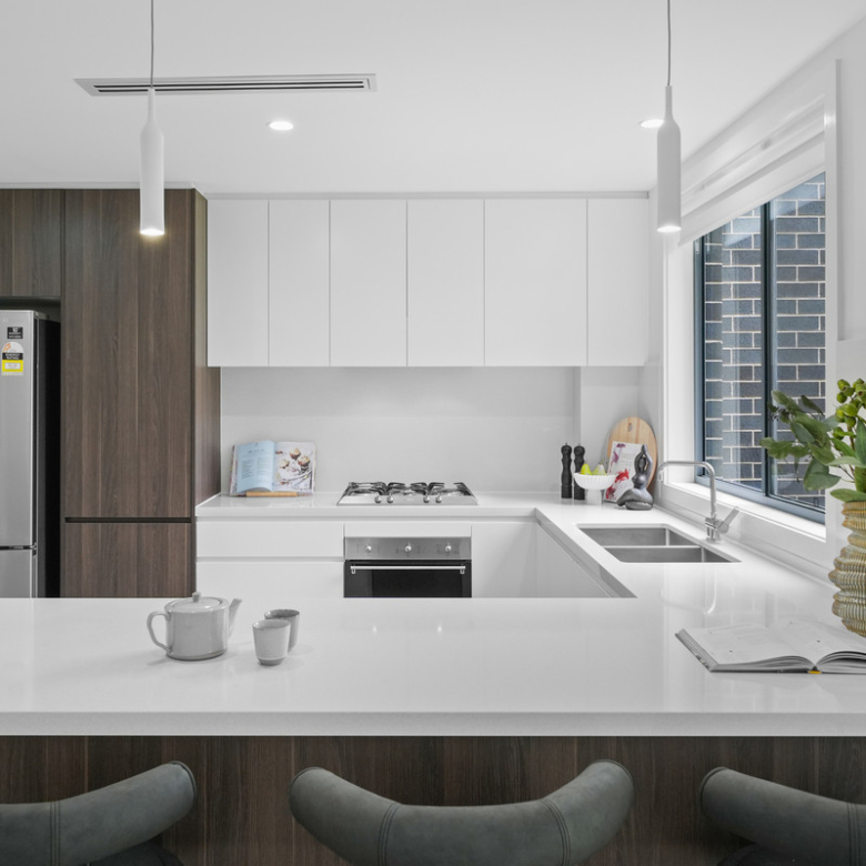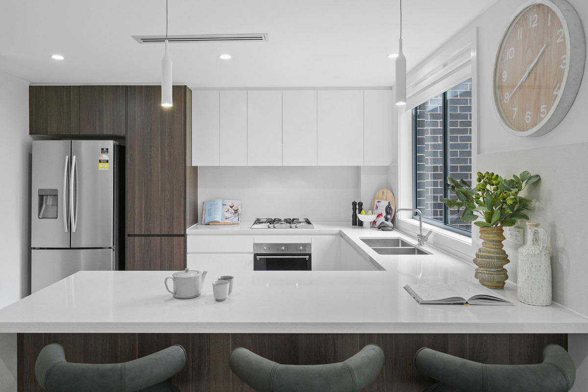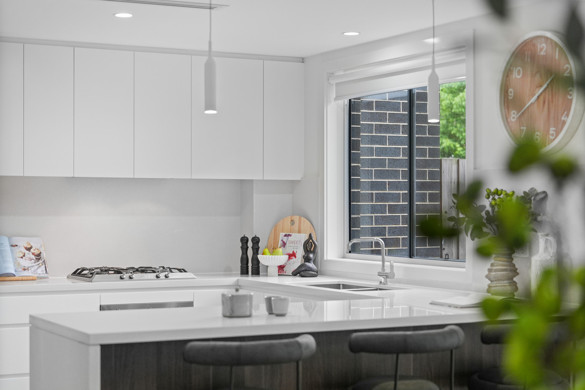 * Modern kitchen featuring stone benchtops, gas cooking, dishwasher and abundant cupboard storage