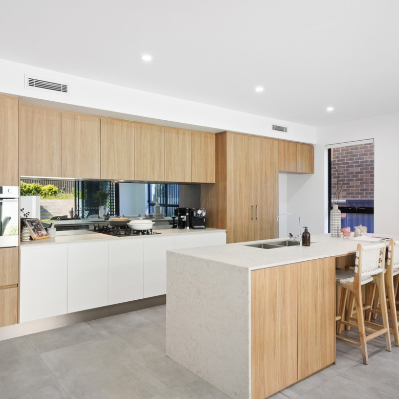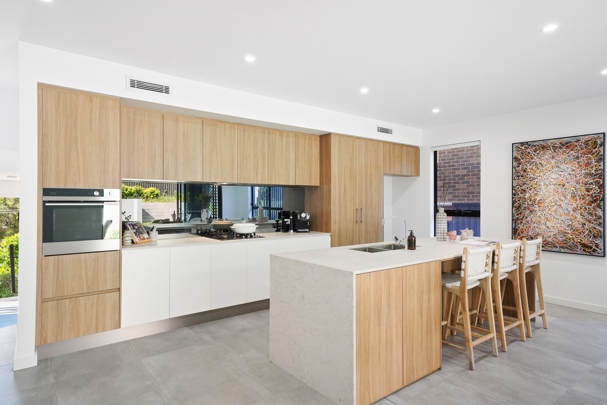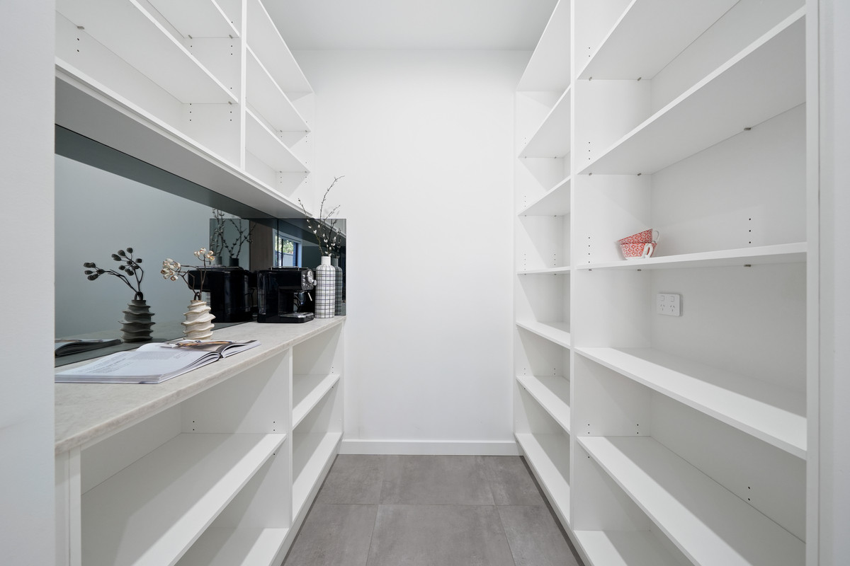 * Sleek designer kitchen with stone benchtops, stainless-steel appliances, gas cooking, and walk in pantry