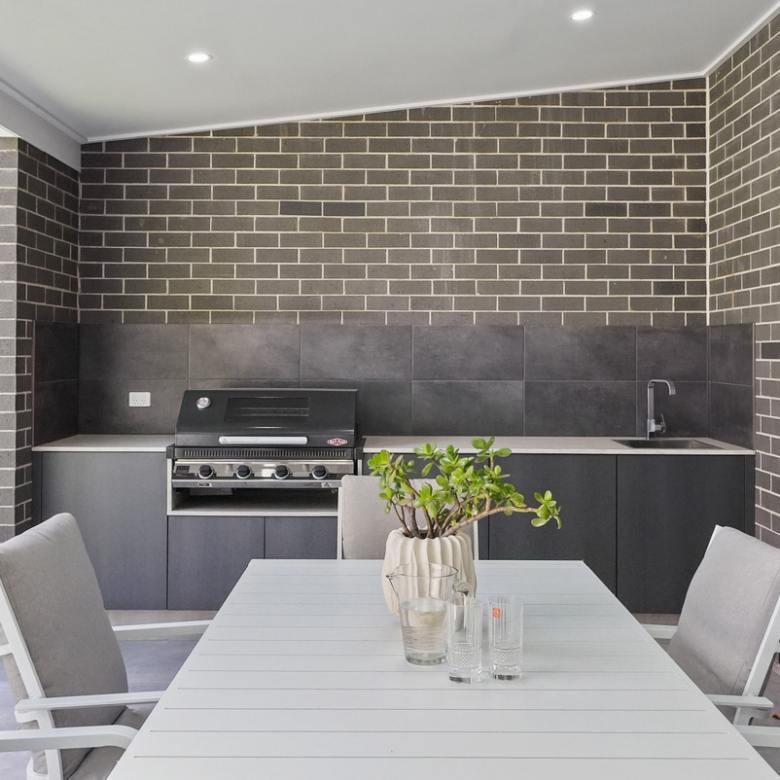 * Expansive covered alfresco with a built-in BBQ, sink, and cabinetry for effortless outdoor dining and gatherings.